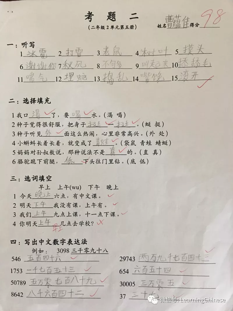 一年级时,基本上每天安排一小时中文学习时间,先让女儿绘声绘色地朗读一遍课文和课后阅读材料,然后开始练习写字组词。每周六去上中文课之前,我会先听写她本周作业的字词,再讲解听写出错的字,让她反复练习直至记住。一年级期末考试,女儿的成绩处于班级中等水平。听说有好几位同学考了满分呢。
