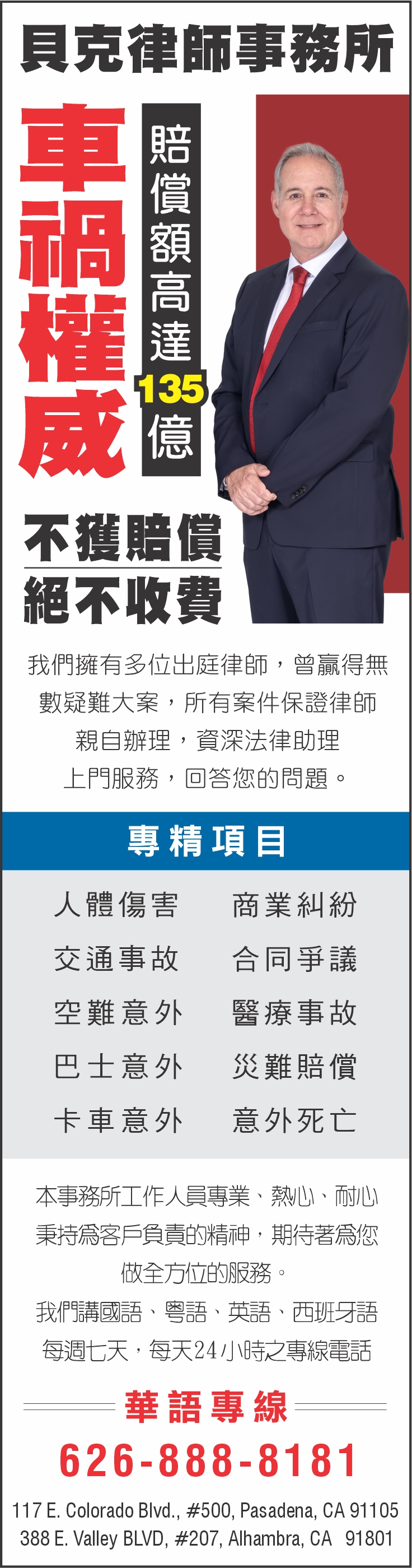 貝克律師事務所是南加州華人社區著名辦理車禍案件的律師事務所之一。作為一個資深、專業、權威且專門辦理各類重大人體傷害和商業訴訟案件的律師團隊,多年來我們辦理了上萬件各類車禍、人體傷害以及商業糾紛案件,在華人社區建立了良好的口碑。五十多年來,本事務所秉持“客戶滿意就是我們服務的宗旨”這一理念,據理力爭,為廣大華人及亞裔人士爭取到了應有的利益,維護了當事人合法權益。我們擁有聯邦法庭審判大律師,具有豐富的辦理車禍案件的經驗。專業、細緻、認真、負責,多年來我們曾贏得無數案件,作為主要律師之一的代理案件最高賠償額達到135億美金,得到了廣大客戶的讚譽和信賴。我們保證為您爭取到最高的賠償。得不到賠償,不收費用。
