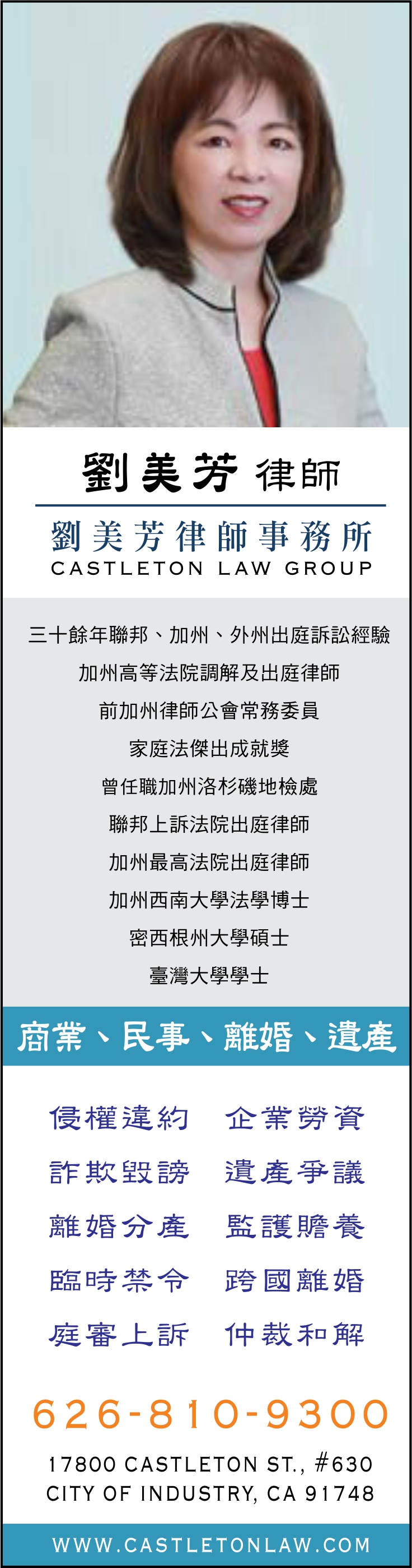 劉美芳律師,加州西南法學院法學博士,1986年起於美國加州開辦律師事務所至今,歷經多年執業淬煉,精通商業、民事、婚姻、遺產法律訴訟。劉律師執業之餘,不遺餘力為社會貢獻,97至01年期間連續四年被甄選為加州律師公會常務委員。曾任職洛杉磯地檢處,以及加州高等法院調庭官,幫助無數纏訟多年的案件取得雙贏。