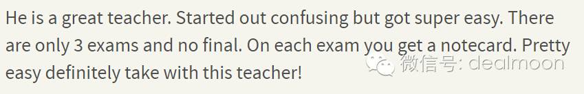"他是个不错的老师,一开始有点难懂,但是其实很容易。只有3个考试和1个期末考试。每个考试你都会有提纲,特别容易,推荐这个老师。"