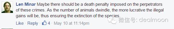 "也许这种罪犯应该判死刑。随着野生动物的稀有,这些非法暴利的行为将会更多,导致稀有物种的灭绝。"