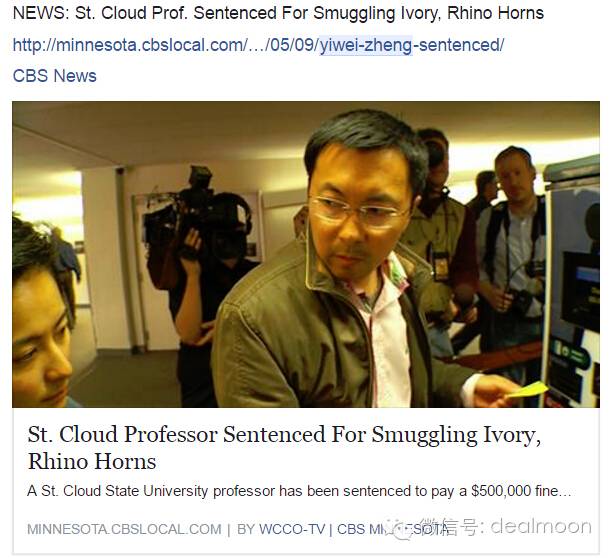 5月9日,明尼苏达州圣克劳德州立大学的终身教授郑义伟(音译)因走私象牙和犀牛角,被美国联邦地区法院判处罚款50万美元、3年缓刑和150小时的社区服务。