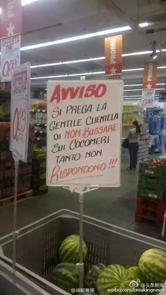 怎么才能挑到好吃的西瓜?我们有个绝招,那就是--敲西瓜!但是,6月17日,微博博主@孤岛守护者发微博说:意大利超市给中国顾客立了个牌子:"尊敬的顾客,请您不要再敲西瓜了,它们是真的不会回应的!!!"