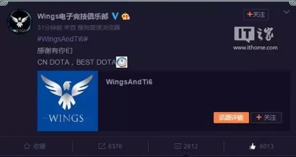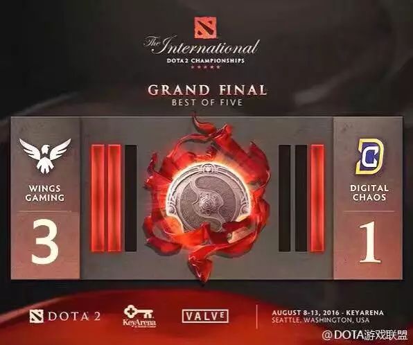 打赢了EG的Wings挺进了TI6的总决赛,迎来了和美国队伍DC的巅峰对决,并最终3-1击败对手,捧起了冠军奖杯。