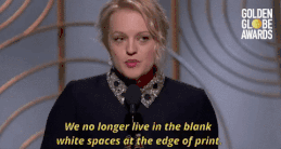 Elisabeth Moss上台说:“我带了这张纸,因为我太紧张了,对自己不太自信。让我引用玛格丽特·阿特伍德的一句话(《使女的故事》原著作者):我们是那些不会出现在书上的人,我们生活在印刷书页的白色边缘部分,我们生活在故事的间隙里。如今我们已经不在生活在故事的间隙里,我们已经成为了故事本身。”