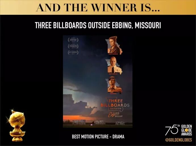 最后一个!恭喜《三块广告牌》获得第75届金球奖剧情类最佳影片!今晚拿下4项成为最大赢家!
