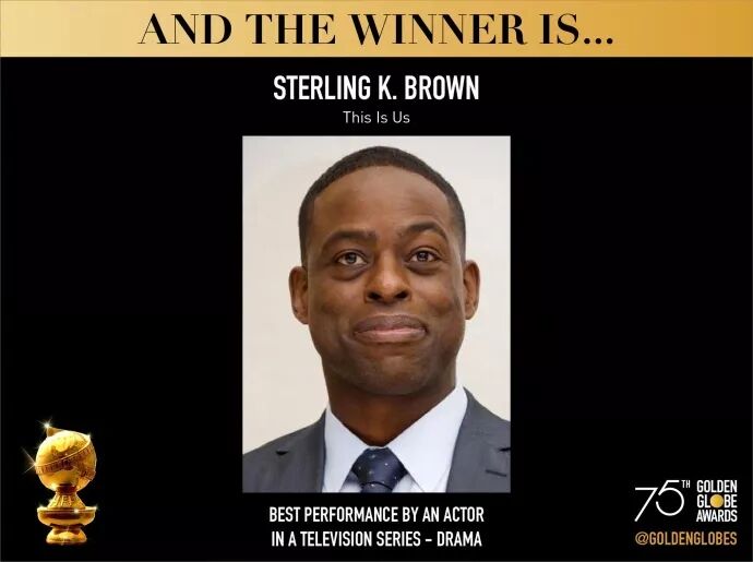Sterling K. Brown凭借《我们这一天》获得第75届金球奖剧情类剧集最佳男主角。今晚也创造了历史——成为金球奖史上第一位赢得剧情类剧集最佳男主角的黑人演员!