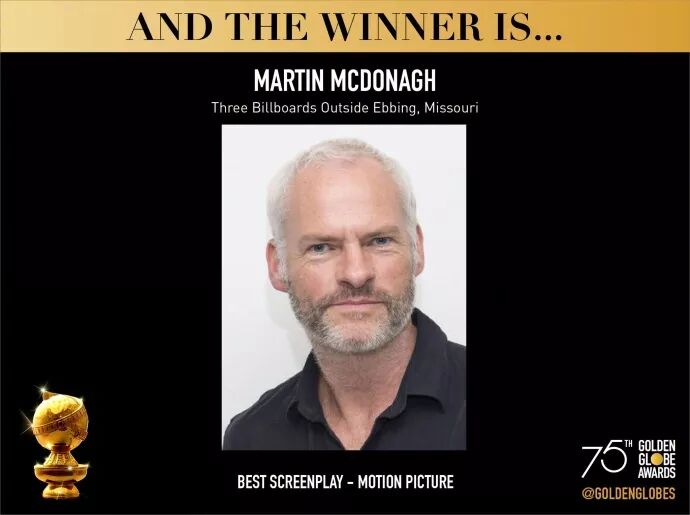 马丁·麦克唐纳《三块广告牌》获得第75届金球奖最佳剧本,这是今晚《三块广告牌》赢得的第二项。