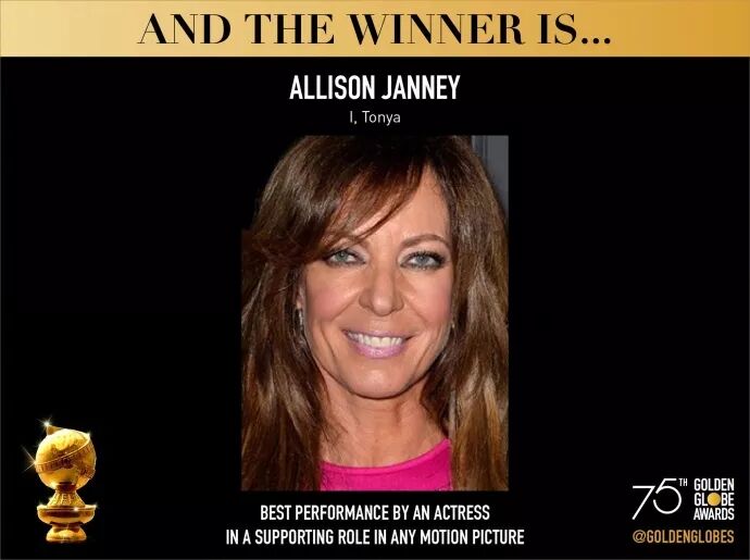 Allison Janney凭借《我,花样女王》获得第75届金球奖最佳女配角,这是她第6次提名金球,首次获奖。她在片中扮演花滑运动员托尼娅·哈丁的母亲,冷酷、毒舌、非常抢戏。