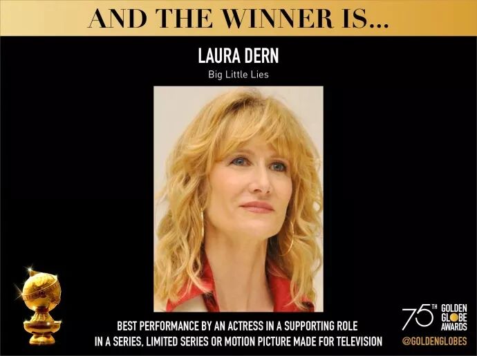 Laura Dern凭借《大小谎言》获得第75届金球奖剧集类最佳女配角!这是今晚《大小谎言》赢得的第三项!基本锁定剧集类最大赢家!邓恩在剧中饰演公司主管,强势又不乏温柔,她对自己的妈妈身份的心理把握让人触动。这是她的第6个金球提名,第4次获奖。
