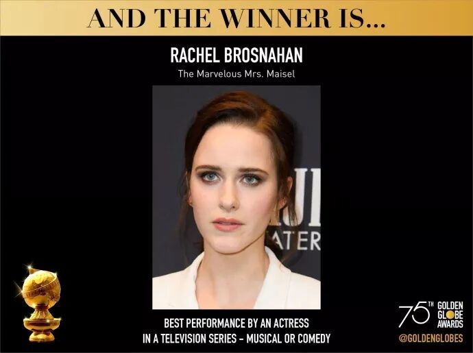 Rachel Brosnahan凭借《了不起的麦瑟尔夫人》获得第75届金球奖音乐/喜剧类剧集最佳女主角。