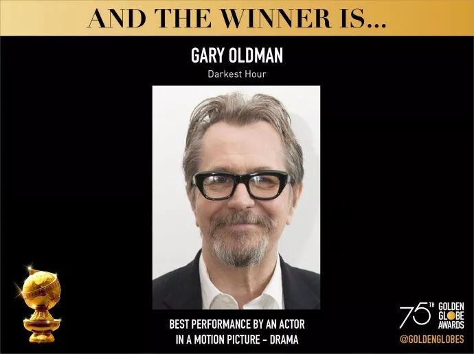 加里·奥德曼凭借《至暗时刻》获得第75届金球奖剧情类最佳男主角.这是他第一次提名金球奖。奥德曼在片中扮演英国传奇首相丘吉尔,很好地诠释了在二战动荡时期的坚定领袖形象,也体现了其性格生动的一面。