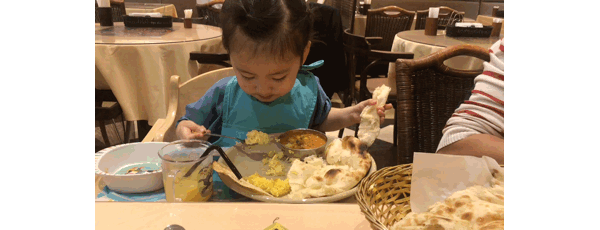 对任何食物接受度都很高,陪我们吃印度菜也津津有味▼