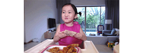 经常有成年朋友告诉我,他们吃饭会拿着Luna吃饭的视频“下饭”。听完以后我只有会心且略带得意地一笑——曾经我也爱在微博上看一个叫“胖肉”的孩子吃饭看得津津有味。有一次看她一个吃烤面包片的视频,可把我馋崩溃了——那么普通的一片面包片,怎么能香成那样!视频没看完,我就去楼下便利店买了包面包片,学着胖肉切成三角形,烤脆了,继续打开视频边看边吃。
