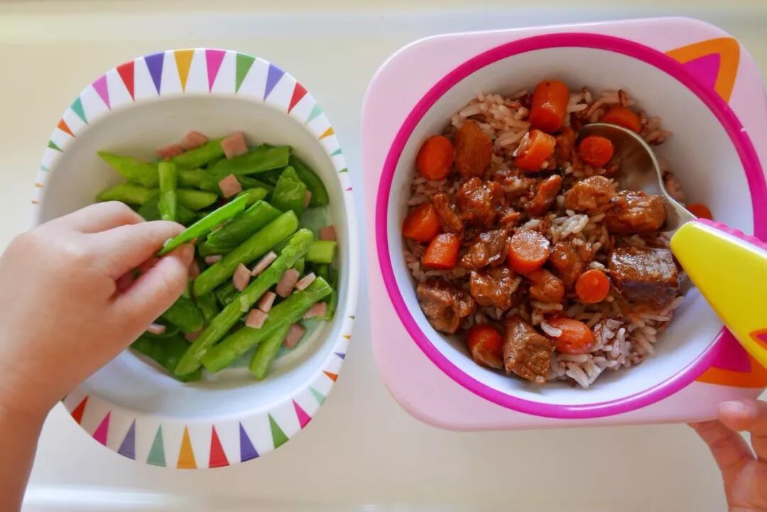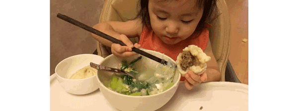 再大一些,就可以慢慢加入家庭餐桌,吃和大人一样的食物了。我一般的做法是让她和我们一起吃一些口味清淡的菜,如果我们吃得比较辣和味道重,就在做饭的时候用同样的食材给她单做,或者炒菜的时候先把她的盛出来再下调料。