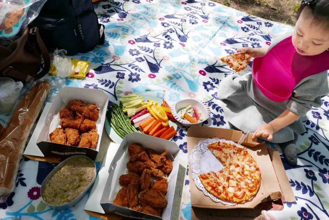 出去野餐,有炸鸡、披萨,也有蔬菜条、hummus▼
