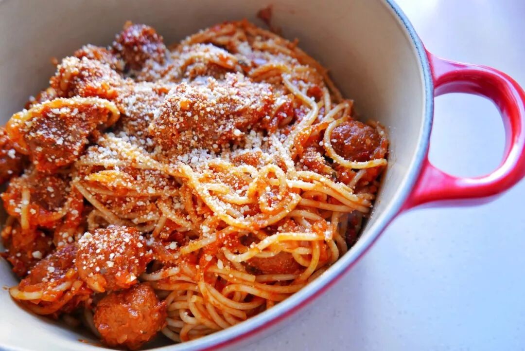 我有个拿手菜,是跟Jamie Oliver学的肉丸意面,Luna不怎么吃蔬菜的时候我就给她做这个,永远受欢迎。做法很简单,用洋葱丁炒香以后,加入西红柿、灯笼椒、芹菜、菠菜、胡萝卜、西葫芦等等等蔬菜打成的泥,和肉丸一起炖成意面酱就好了。反正平常那些孩子不怎么爱吃的蔬菜都可以扔进去,做出来香得不得了。Luna幼儿园餐会的时候我带了一大锅去,瞬间就被孩子们瓜分了▼