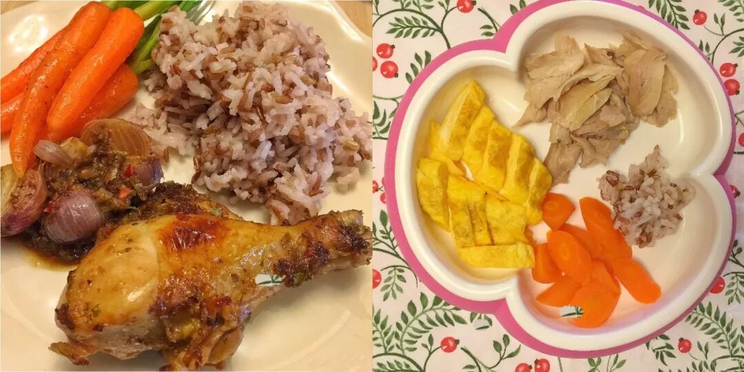 其实在做Luna的辅食的时候我一直是这样做的:尽量和大人的饭菜同样的食材,尽量不搞特殊化。这是更早一些,Luna差不多8个多月的时候,某一天我和康吃烤鸡腿,给她白水煮了鸡腿,煮了点胡萝卜,煎了个蛋,分了一点点米饭给她。大人加孩子的饭不过40分钟,就全部上桌了▼