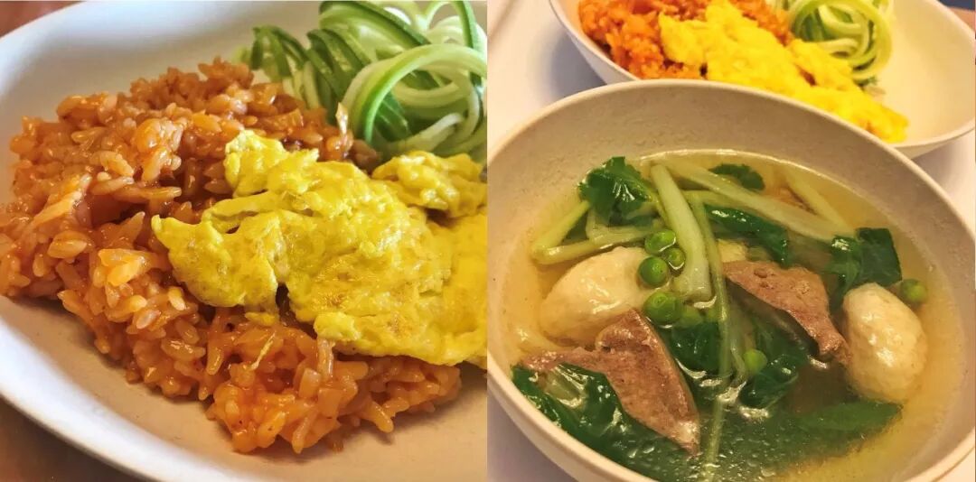 番茄炒饭铺个煎蛋,外加西葫芦丝。猪肝鱼丸青菜汤▼