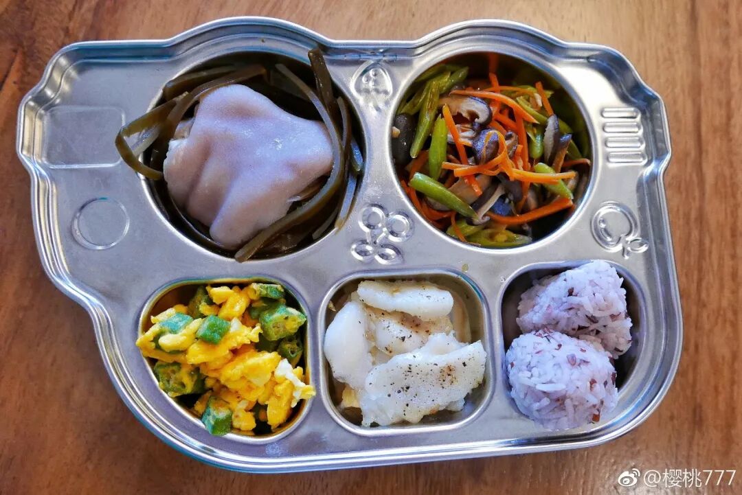 Luna得到的是蹄花海带、橄榄油拌三丝、秋葵炒蛋、煎鱼和饭团。基本都是我在做全家饭菜的时候用同样的原料插空顺手做的(当然也不是天天都有功夫这么做)▼
