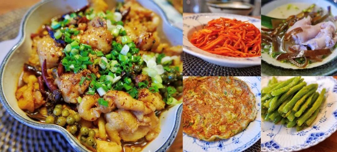 以某一天我们家的一餐为例:大人吃水煮鱼、辣炒胡萝卜丝、菜脯蛋、凉拌四季豆、海带蹄花汤▼