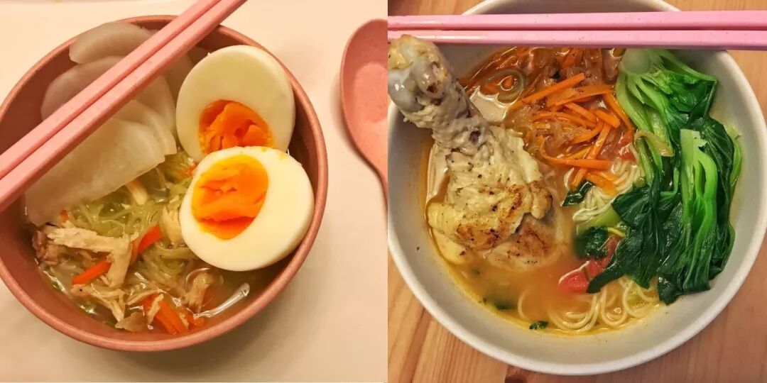 鸡丝面和鸡腿面。鸡腿煮熟以后稍微煎一煎,撒一点黑胡椒粉,盐都没有放▼