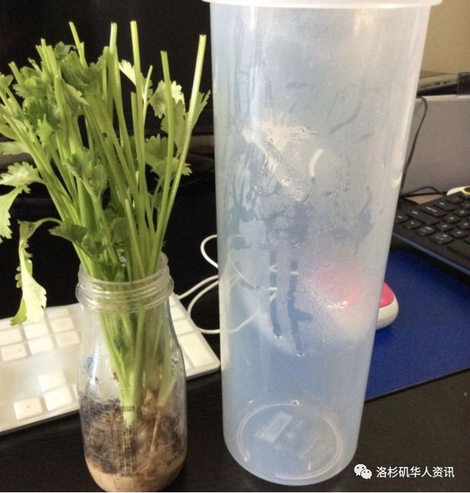 2、将香菜的叶子和杆子尽量不弯曲的插入瓶中,加水没过香菜根