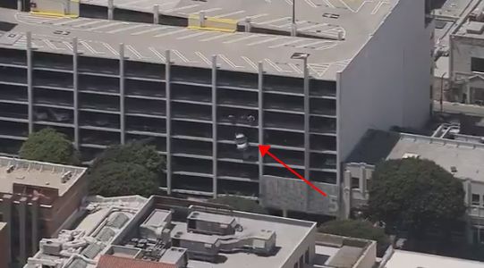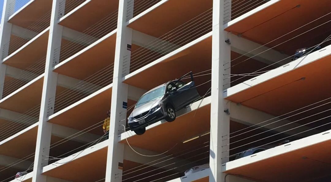 见过洛杉矶开车猛的司机,没经过这么猛的!一名女司机停车场把油门当刹车踩,差点把车开飞出4层楼停车场!