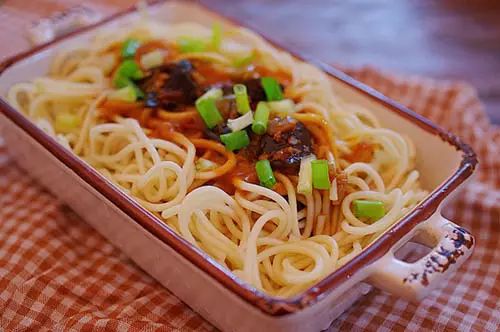 7、将煮好的面条沥干水分,放放入碗内,然后浇上炒好的杂酱。搅拌均匀即可食用。