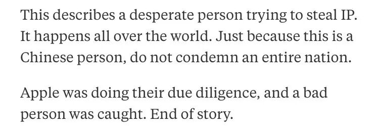 另外一位美国网友则认为,这个问题的假设 “这么多中国人盗窃美国公司的商业机密” 根本是以点带面:苹果通过记录,发现一名员工的做法可疑,苹果进而按程序展开调查,抓住了一个坏员工,而这个员工碰巧是中国人,仅此而已。