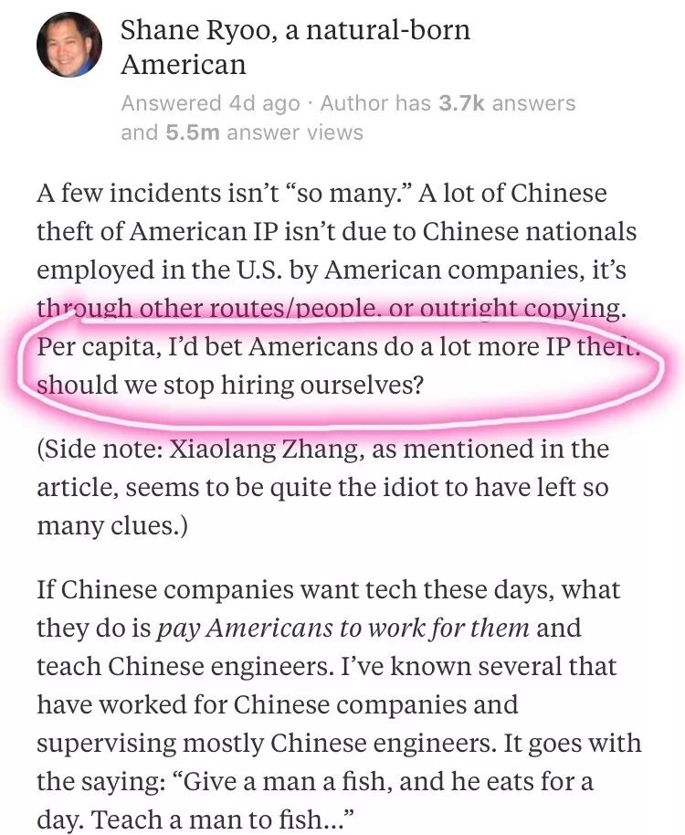 “很多中国盗窃美国知识产权的案件里,盗窃者并不是美国公司雇用的中国公民,而是通过非员工直接拷贝信息之类的其他手段。按人均计算,很有可能知识产权盗窃得最多的是美国人。按这种逻辑,难道美国科技公司应该停止雇佣美国人吗?