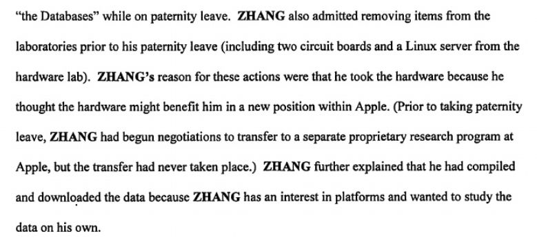 根据张当时所处职位,使得他成为整个苹果公司有 “广泛访问安全和保密的内部数据库” (以下简称“数据库”)权限的 2700 人之一。因为发现张访问了这个保密级的数据库,苹果公司随即请 FBI 介入调查。