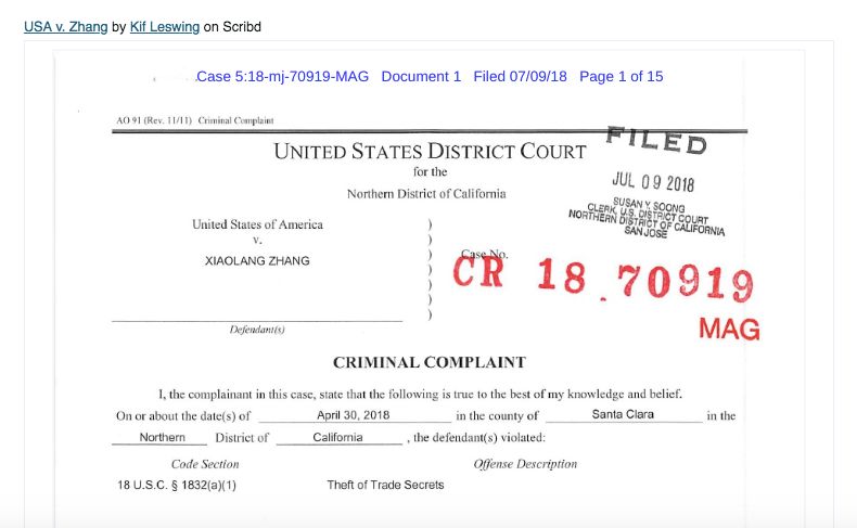 但这次 FBI 逮捕工程师张晓浪,却上升到了刑事诉讼层面。