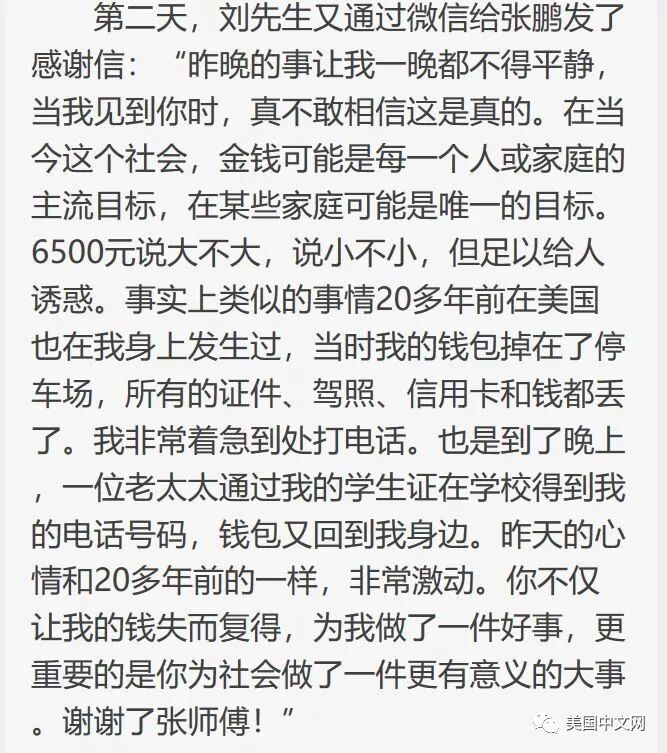 见到张鹏,刘先生非常感激,他坦言微信和支付宝对于在美生活20多年的他来说很陌生。听朋友说回国都用这两种线上付款,于是自己也学着下载了app,谁曾想美国支付时,通常打出来的数字后面是自动的小数点,所以刘先生输入65后看没有出来.00,就自己又多打了两个零,结果就变成了6500元。这位刘先生一定要拿出部分小费感谢张司机,不过张司机坚持把多付的钱都还给了刘先生。这个故事听起来很暖心,出门旅游特别是回到阔别了多年的故土,能够碰到好心人是一件幸运的事情。