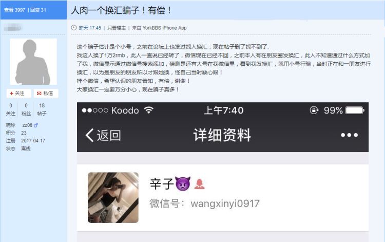 很多人可能会通过微信交易,例如在网上发布换汇信息,留下微信进行网络交易。可以说,这种方式是最危险的!因为在微信上,骗子极易伪装,要知道,这是骗子的专业!