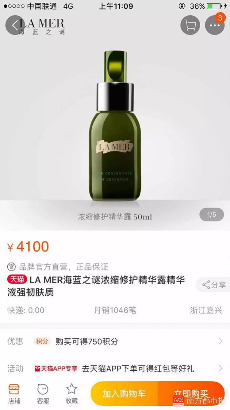 南都记者在海蓝之谜天猫官方旗舰店看到,海蓝之谜相关产品价格动则数千,以一款名为海蓝之谜浓缩修护精华露的在售产品为例,仅50ml,要价高达4100元。