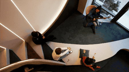 一层到二层中间,我做了一个弧形的地台连结,这个地台不仅通向户外,也是一个多功能区。朋友来了可以在这里可以自拍,甚至可以玩玩乐器,做一场小型的音乐会。