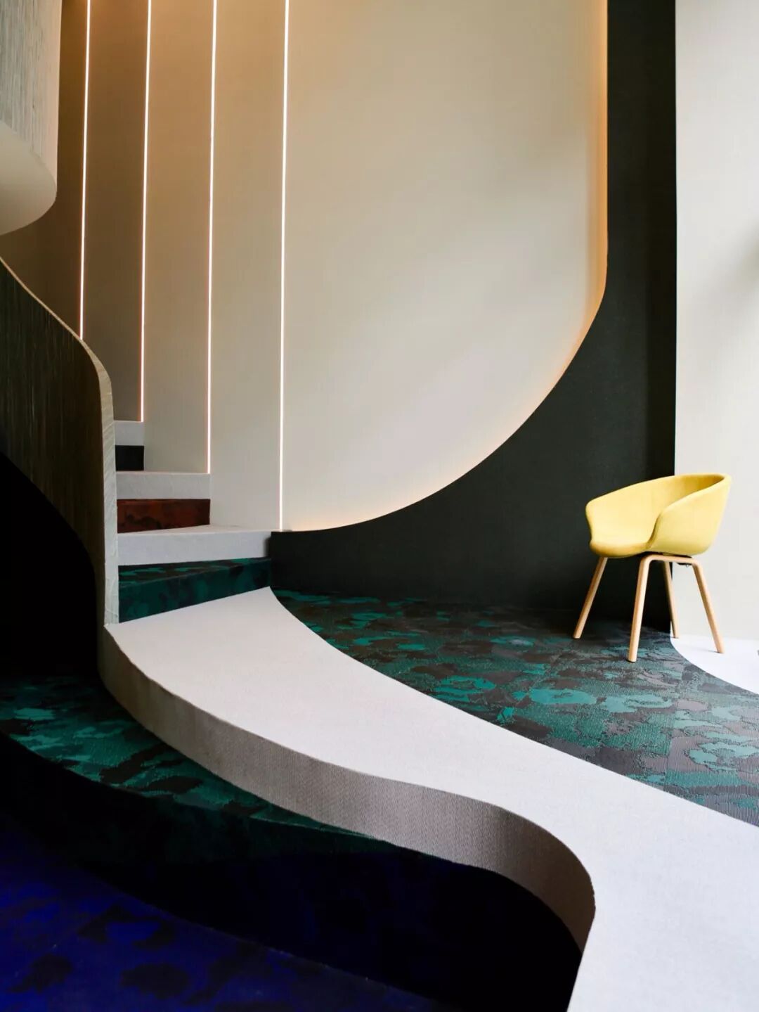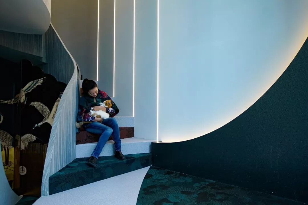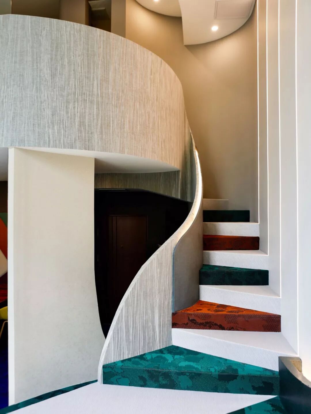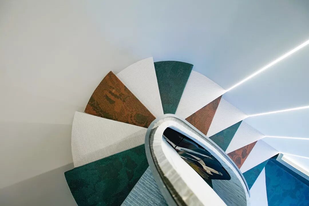 楼梯外面的壁纸,用的是服装里的褶皱概念,用呢子的纹理来去做楼梯的内侧。