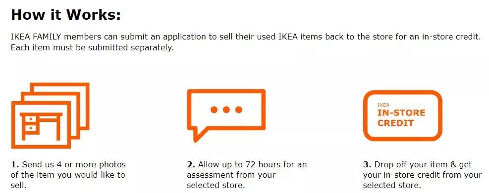 而且这个兑换的过程一点都不繁琐复杂。首先,想要参加该计划的顾客必须注册成为宜家家庭成员,当然,这个注册是免费的。然后客户可以通过他们的账号来提交申请,选择当地的宜家商店,将家具出售给该店。当交易完成以后,客户获得店内的信用积分,这个积分是可以用来抵消现金支付的哦。以下是详细的步骤: