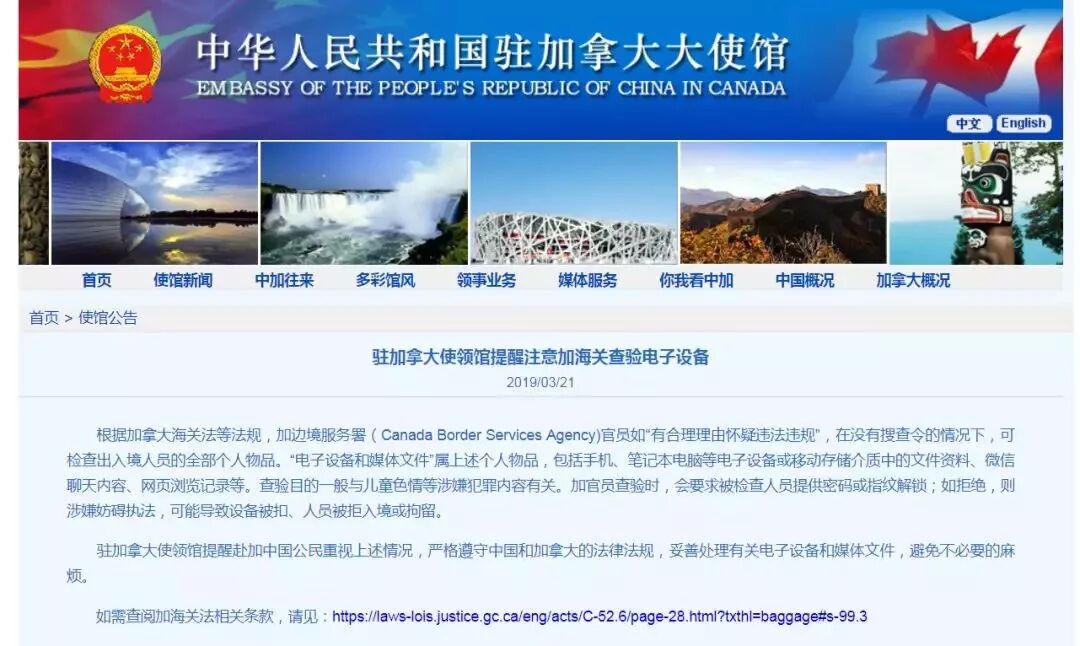 提醒中国公民入境加拿大时注意加拿大海关对电子设备的查验,