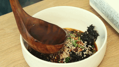 2、煮饺子的时候,舀一勺滚烫的饺子汤冲开调料,酸汤底料就调制好了。