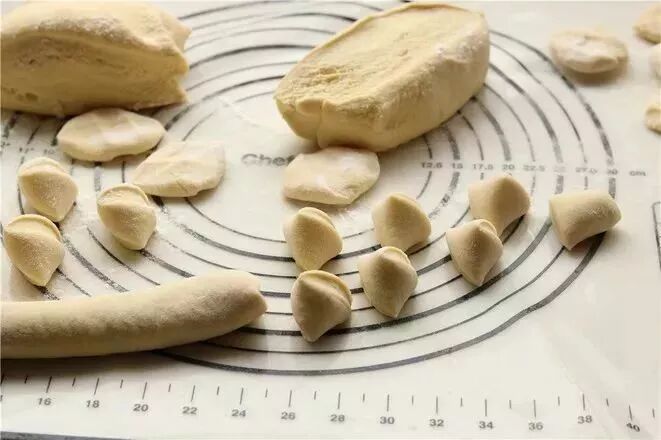 4、准备擀饺子皮。自己醒发好的面团柔软有弹性,搓成长条,再切成大小均匀的剂子。