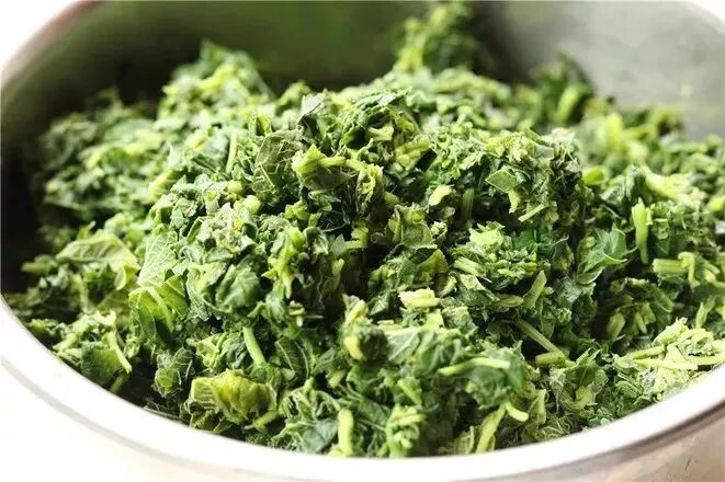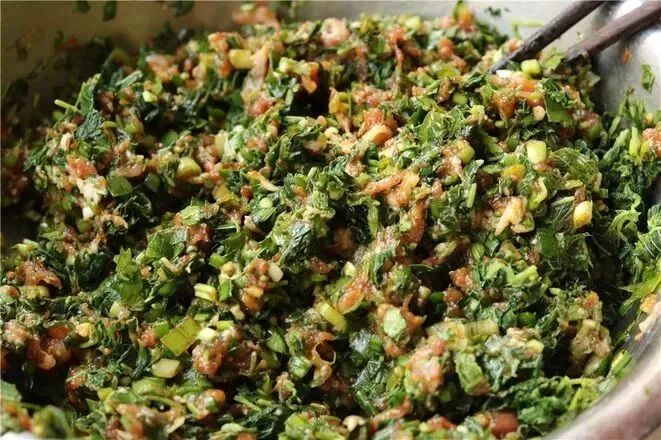 再加入苋菜末去搅拌均匀,饺子馅儿就做好啦。