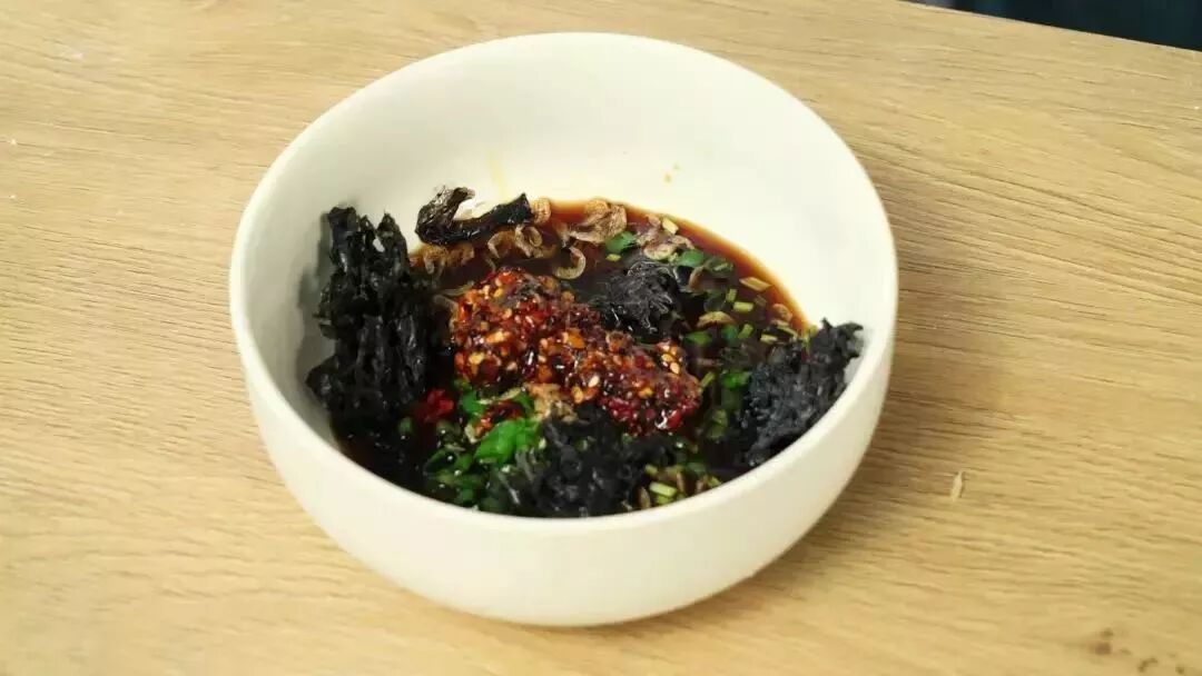 1、酸汤制作必不可缺四样东西就是:虾皮、香菜、葱花、紫菜。将这四样放进碗里,再倒入少许的酱油和香醋。