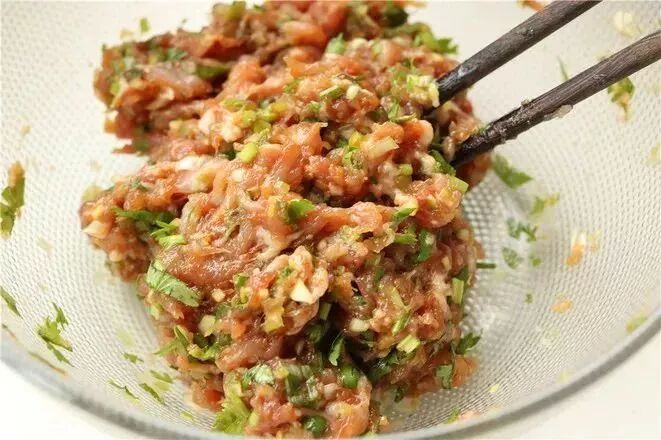 3、准备肉馅。肉剁成泥后,加入葱末、姜末等拌匀,加入一大勺蚝油,适量的生抽、盐、五香粉和芝麻油,沿着同一个方向搅拌均匀入味。