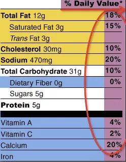 DV%就是Daily Value,这个百分比是明确给出了本包装食品提供的各类营养素,占人体每日所需(以2000卡路里来算)的百分比值。