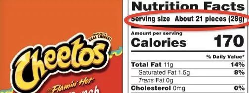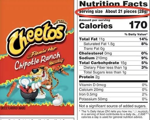 下面标注所有的热量和营养素量,都是基于per serving每次建议摄入量来算的,比如21根薯片热量是170卡,吃一袋子显然卡路里要上千了....