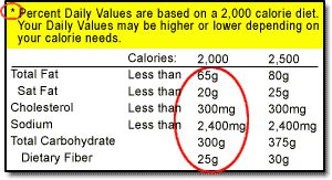 上面列出了一个成年人每日要摄入的脂肪、胆固醇、食物纤维的量。(基于每日2000卡路里的饮食)