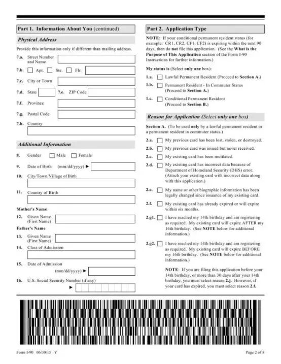 在第二部分专门有一栏供申请人填写自己将要经行的海关关口。(I-90可用于多种绿卡的补办,但是作为EB-5临时绿卡持有人,这项是必须要填写美国邮寄地址的)至于居住地址,同样可以填写美国境内或者境外的地址(商业地址和邮政信箱就不适用)。移民局是不会按照这个地址寄送绿卡的。那么作为EB-5临时绿卡持有人,依旧必须填写美国境内的居住地址。