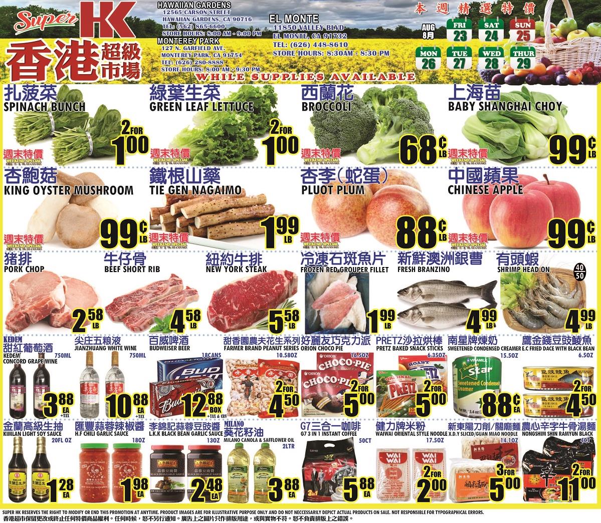 香港超市( 08/23-08/29) 杏李、中國蘋果、杏鮑菇、鐵根山藥、澳洲銀曹、有頭蝦、紐約牛排、牛仔骨、豬排、是拉差蒜蓉辣椒醬、甜香園花生、農心牛骨風味麵、關廟麵、Pretz沙拉棒、南星牌煉奶、百威啤酒等